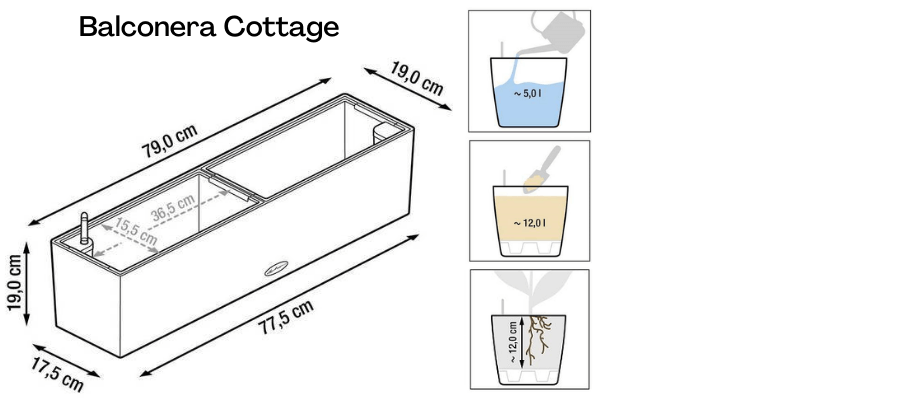 - Balconera Cottage ist ein Gartentopf zur Gestaltung Ihrer Terrasse oder Ihres Gartens. Der Topf kann auf den Boden, auf einen Tisch, eine Fensterbank oder an eine Wand oder Brüstung gehängt werden. Er verfügt über ein eingebautes Bewässerungssystem, das e